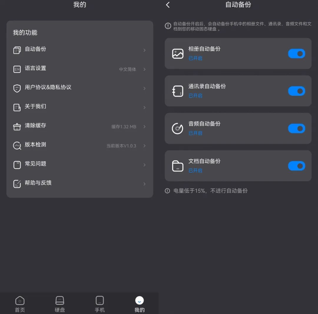 同时也可根据实际情况对相册、通讯录、音频、文档等设置自动备份,避免在文件增加、修改的情况下无法及时备份或频繁手动备份,像有些非常重要的通话录音、会议录音可能很容易在手机上误删,有自动备份就相当多了一重保险。