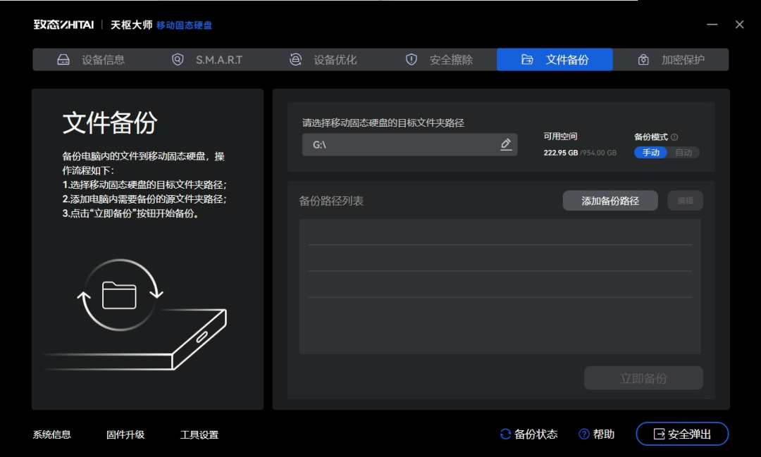 此外,也可以通过天枢大师对致态灵·先锋版移动固态硬盘进行安全擦除或者添加指定文件夹,对重要文件及时备份。