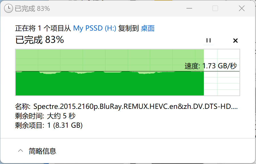 在实际传输过程中,将一部50GB的4K电影从致态灵·先锋版移动固态硬盘拷贝到电脑桌面,传输速度在1.7GB/s左右,波动非常小。