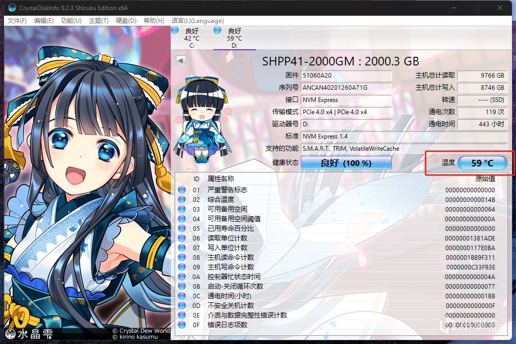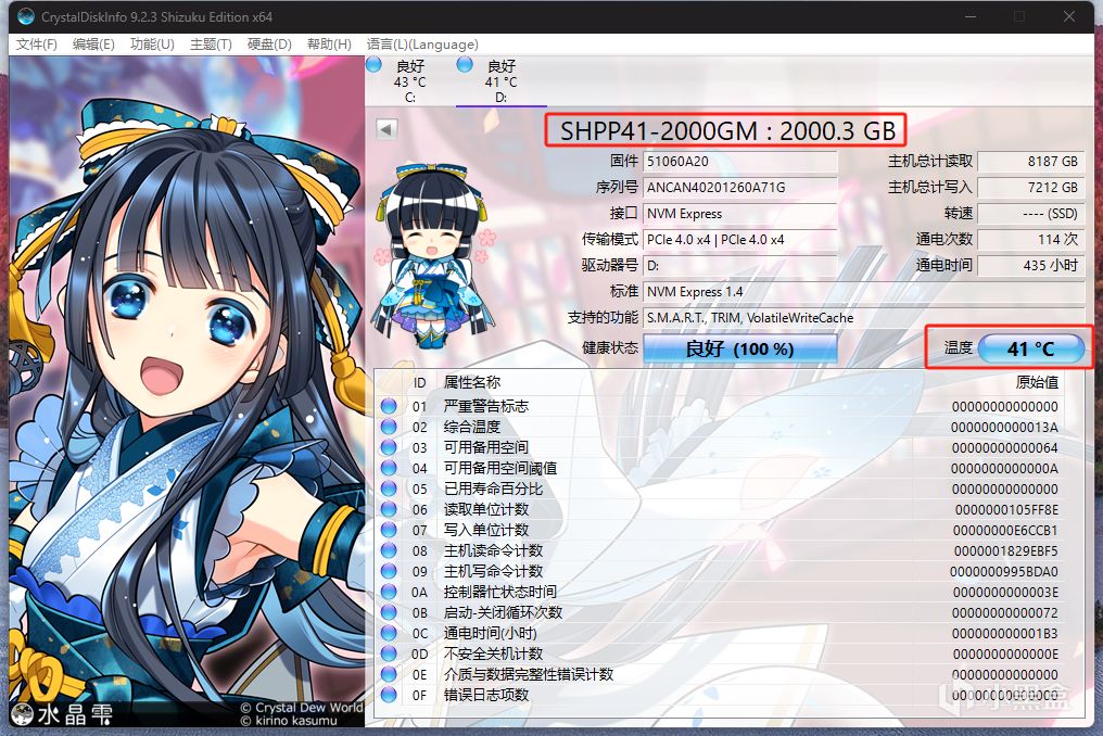 這是海力士 P41的固件信息,從上圖之中我們也可以看出,它安排在了主板的第二硬盤位。另外,從軟件的監測數據來看,它的溫度顯然要更低一些。