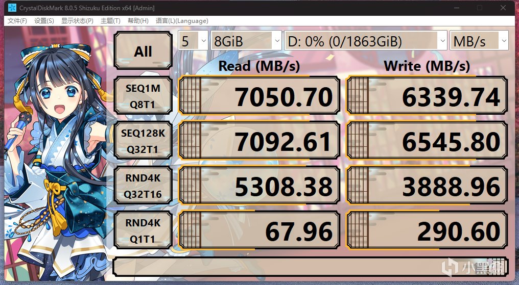 在CrystalDiskMark的跑分之中,它的讀取達到了7050.70MB/s,寫入達到了6339.74MB/s。看來,作爲存儲領域的翹楚,在SSD上的發力,也確實非同一般。不過,這裏還是需要特別說明一下,由於安裝是在第二硬盤位,所以速度會較第一硬盤位的直連CPU,有那麼一丟丟的差別。不過,高於官旗7000MB/s的標稱,也確實很強。