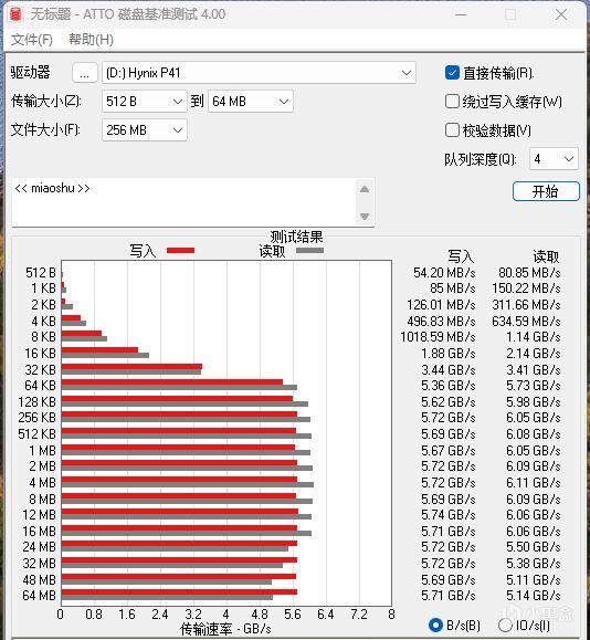 我們還使用ATTO對其進行了測試,這項測試可以看出海力士 P41對於不同大小文件讀取的一個更直觀信息。從上圖的結果中,我們能夠看到,在64KB大小的文件時,海力士 P41就已經接近了最大性能。在後續的讀寫測試中,它基本穩定在了寫入5.7GB/s、讀取5.5-6.0GB/s左右。