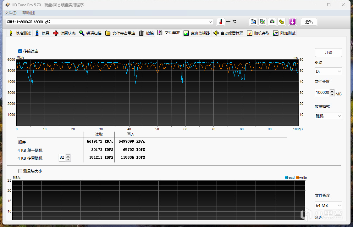 我們還使用了HD Tune Pro對其進行了測試,從中也可以看出,不論是讀取還是寫入,它的速度均保持穩定,幾乎沒有什麼過大的波動。在100GB的文件測試之中,它大多維持在5500~6000MB/s之間,看來,有着外置緩存,確實是相當不錯的!