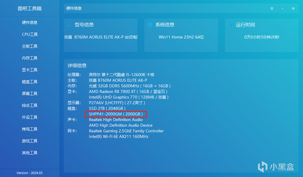 當然了,SSD並不是用來擺着看的。那麼它的實際性能怎麼樣呢?我們也對其進行了專門的測試。上圖是本次測試的平臺,它使用了Intel i5 13600K CPU、技嘉B760主板、掠奪者16GBx2內存(同樣的海力士顆粒),紅框的部分就是本次測試的硬盤。