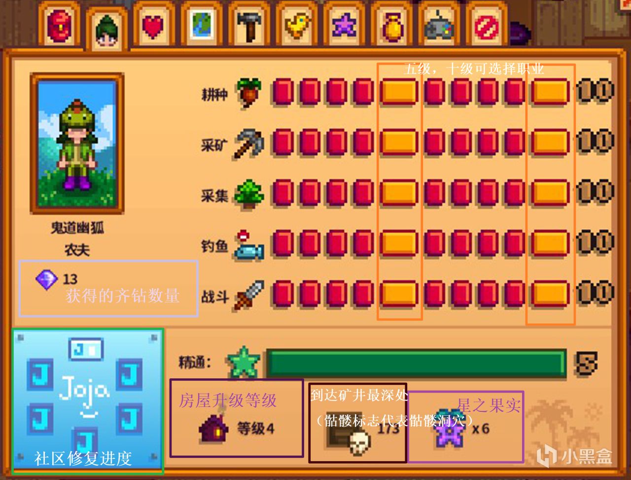 ①初始物品栏只有一行(12格),可在皮埃尔的杂货店购买背包升级服务(一共可升级两次)