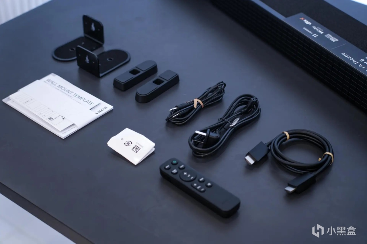 在配件方面,索尼HT-A8000提供了掛壁式支架 X2、HDMI線纜、交流電源線、桌面支架 X2、中置聲場同步模式線纜、掛壁式安裝模板等。