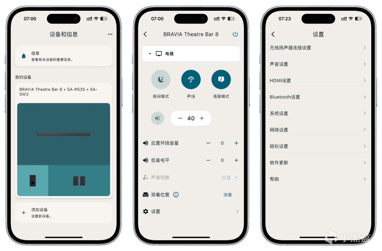 該APP會指導完成初始設置,協助進行故障排除,並能夠控制音量模式等。它還能夠提醒進行軟件的更新和升級,同時能夠控制兼容的電視機。同時觀看位置聲場校正,聲音設置都是在這個裏面設置的。