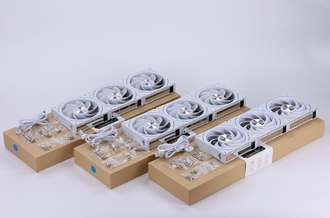 海景房散熱要拉滿,風扇當然不能拉胯,直接三套安耐美 VISCOOL CL-30三聯裝散熱風扇(2反+1正)安排。風扇三圍:120*120*30mm,3把風扇採用不可拆卸的一體化設計,線材也採用一線通的設計。