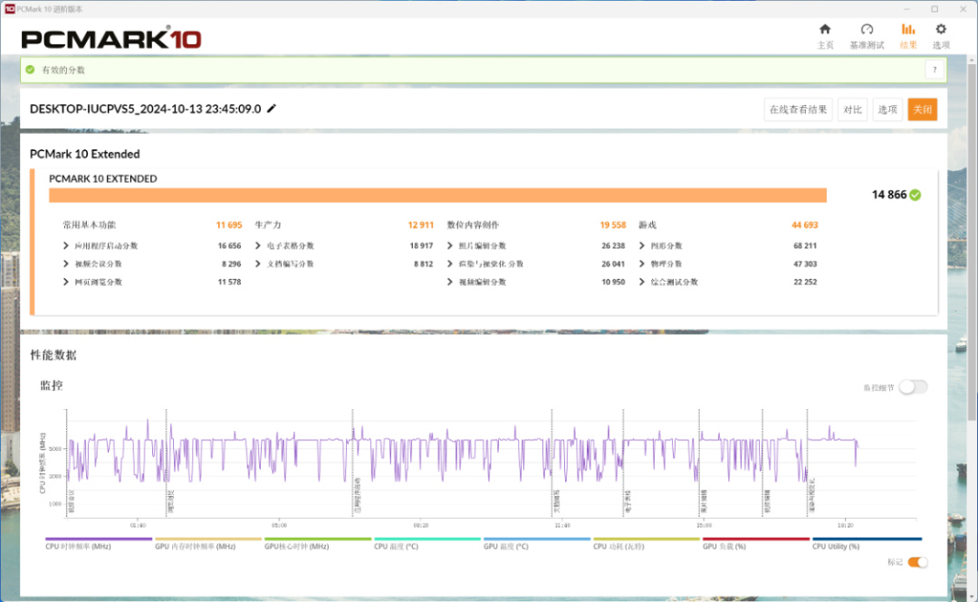PC Mark Extended整機測試,整機得分14866分,常用基本功能測試得分11695分,生產力得分12911分,數爲內容創作得分19558分,遊戲得分44693分;