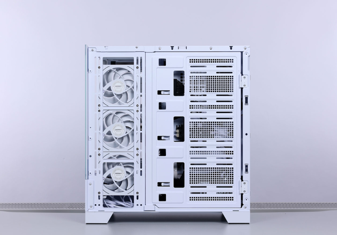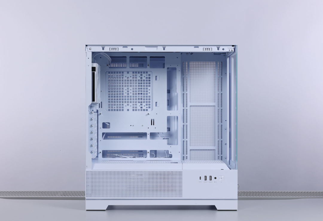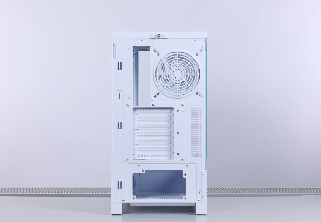 機箱內部空間充沛,最大支持ATX規格主板,顯卡安裝限長420mm。散熱方面,可以兼容180mm高以下的風冷,支持頂置/側置安裝360冷排,至多可以安裝10把120mm規格風扇。機箱尾部預裝一把安耐美CL-30白色積木風扇。