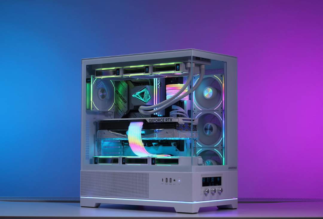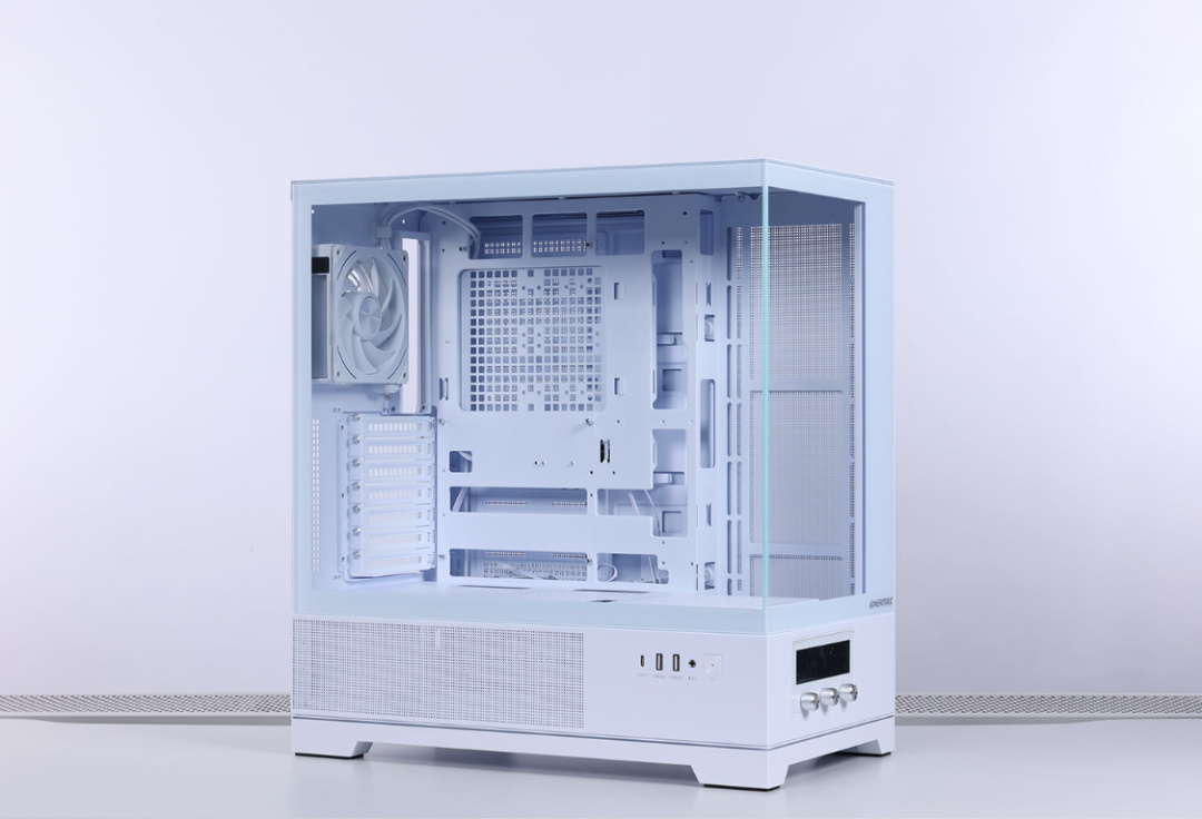 普通的、曲面的、三面玻璃的,對於統治機箱審美已經好幾年的海景房機箱,咱也算得上身經百戰了。不過今兒這臺海景房機箱,又帶來了新的驚喜。今兒的主角,白色的安耐美D58AIR空調海景房。機箱三圍,451*258*491mm,雙面高透鋼化玻璃面板及無立柱設計,但特殊的是,咱還支持溫度可視和散熱檔位可調功能,空調海景房也由此得名。