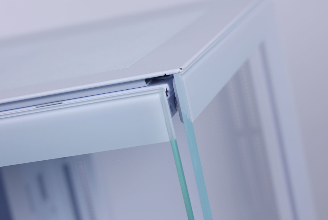 機箱各個金屬面板都配備了大量散熱網孔,可以有效保障散熱。同時,支持三面快拆,左側玻璃面板採用了球形卡口+卡榫的方式進行固定(玻璃側板邊角採用斜切設計,貼合更完美),頂部的蓋板則採用滑動卡榫+手擰螺絲的方式進行固定,右側面板則採用卡榫固定,搭配頂部蓋板的限位設計,貼合緊密。