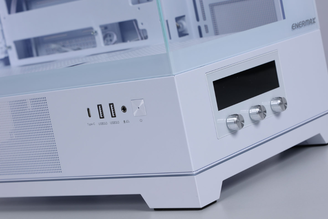 機箱I/O面板位於機箱左側底部,配備了2個USB 3.0、1個Type-C(20Gbps)、1個3.5mm二合一音頻口以及1個帶有CD紋路和指示燈裝飾的開機按鈕