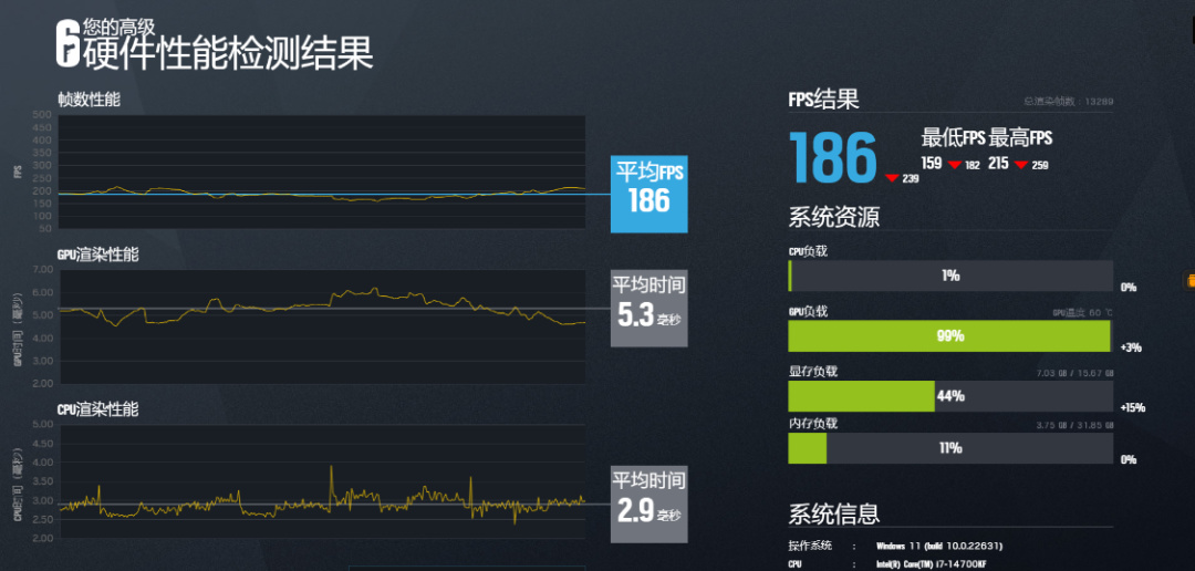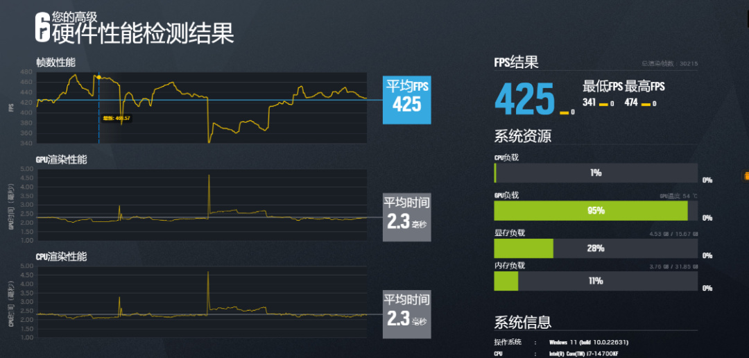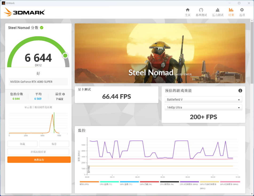Steel Nomad遊戲基準測試,可以測試出顯卡在4K分辨率下,遊玩圖形API爲DX12遊戲時的平均幀數,並根據幀數穩定性進行評分。整機得分爲6644分,遊戲平均幀數爲66.44FPS;