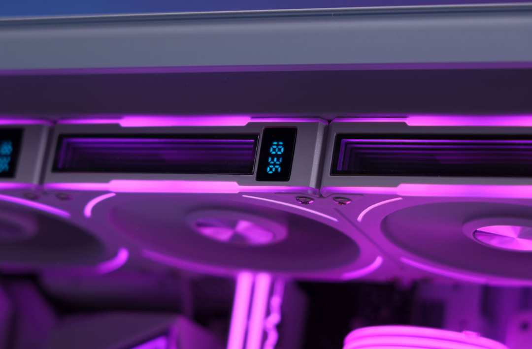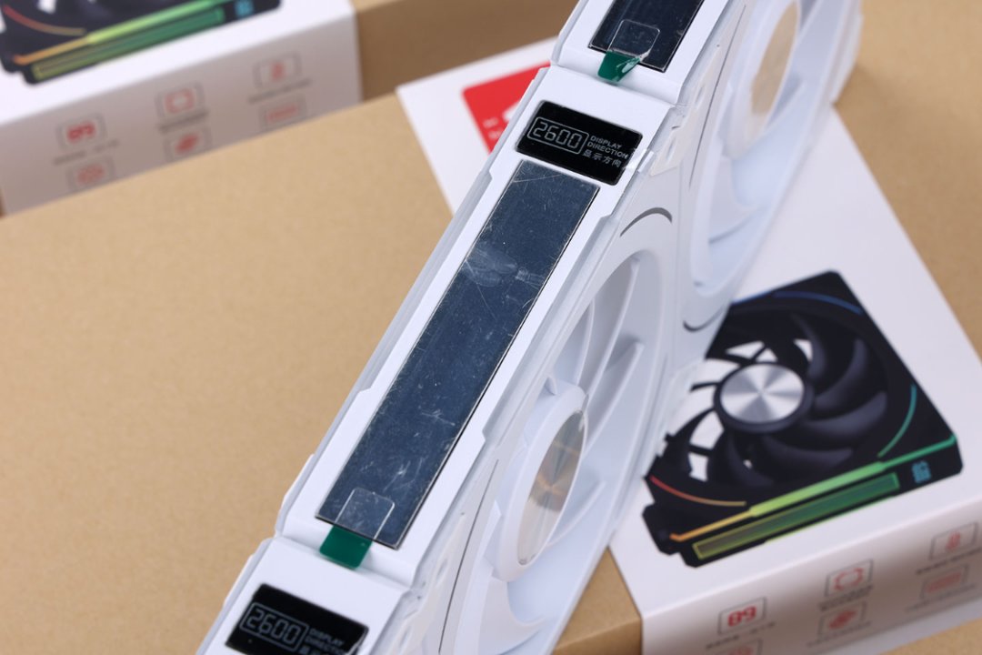 而在風扇邊框的側面,還設計了一塊支持實時顯示風扇轉速的數顯屏幕和支持ARGB千層幻境燈效的鏡面發光板,搭配上風扇正面的4個弧形燈條,整個風扇在點亮後可以展現出十分精緻的顏值表現;