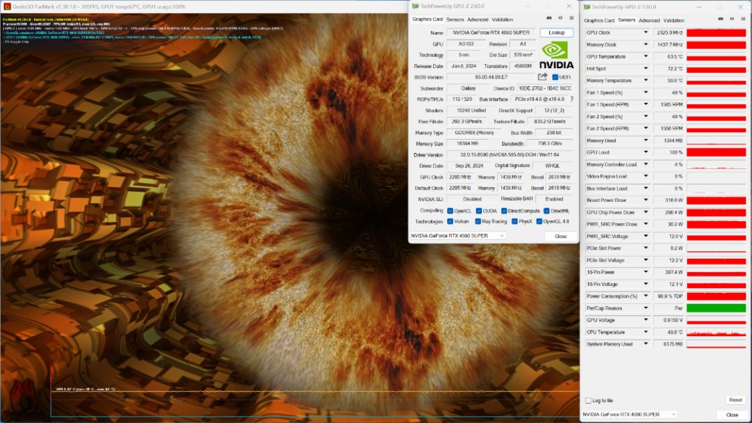 FurMark 烤機測試,烤機25 Min,顯卡溫度爲64°左右,顯卡功耗爲320W左右;