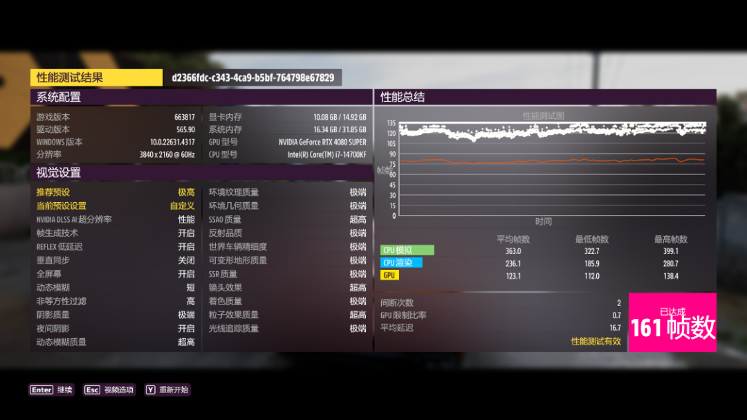 《極限競速·地平線5》遊戲中,極端畫質,極端光追,開啓DLSS 3.0並設爲超高性能模式,4K分辨率下,遊戲平均幀數161 FPS;