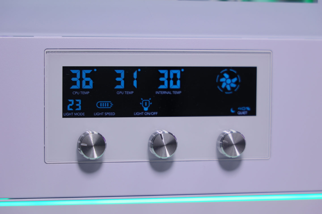 機箱前面板底部區域有一塊125*60mm的可視化屏幕區域(空調面板既視感),連通主板USB接口,搭配專屬驅動軟件,可以實時獲取CPU和顯卡的核心溫度,還配備了一個可移動溫度探頭實時監測機箱內部/箱體的溫度信息。屏幕下方的3個旋鈕,從左至右則分別爲控制機箱燈光模式、燈光開關、風扇轉速的控制按鈕,通過這些按鈕,玩家可以對機箱內置的23種燈效進行4檔速度調節,也可以選擇一鍵開啓/關閉機箱燈條與風扇的ARGB燈效,還可以對機箱風扇從安靜到暴力的4檔轉速調節。既能顯示溫度信息,還能通過調節風扇轉速控溫,所以,空調海景房咱也算是名副其實吧。