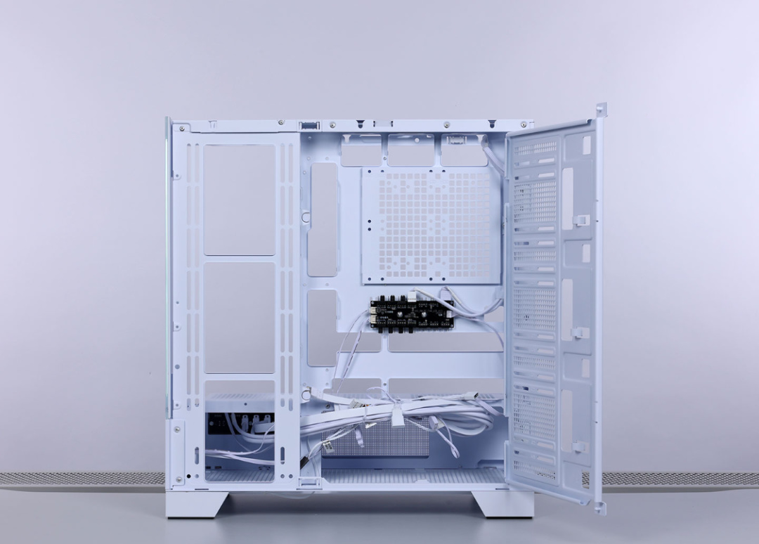 機箱背側理線空間也非常充沛,並配備了一塊合頁式擋線板。此外,還搭載了一個6個5v 3Pin ARGB+8個PWM小4Pin接口的集線HUB。底部電源倉最大可安裝長度不超過250mm的ATX電源。機箱還在主板開窗處,還有一塊可拆卸的網孔面板,面板上則預留了用於安裝硬盤的螺絲孔位,搭配上擋線板上的孔位,整個機箱一共可以安裝3個3.5寸 + 2個2.5寸SATA硬盤。