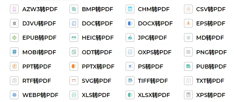 PDF文件可以被轉換爲10種不同的文件格式。AZW3, BMP, DjVu, ePub, JPG, PNG, MOBI, SVG, TIFF 和 TXT。