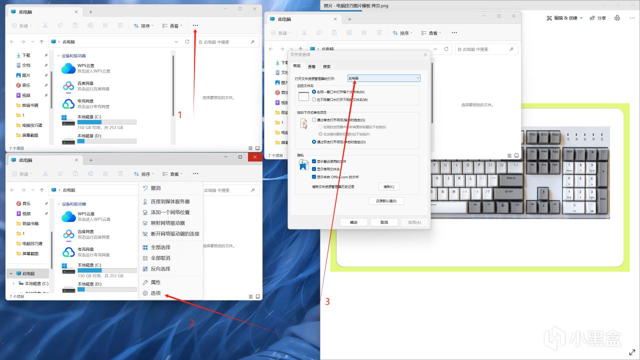 第一次如果不設置的話,會打開主文件夾,需要設置一下,首先WIN+E,然後點擊三個點,再點擊選項,將第三步中選項改爲此電腦即可。