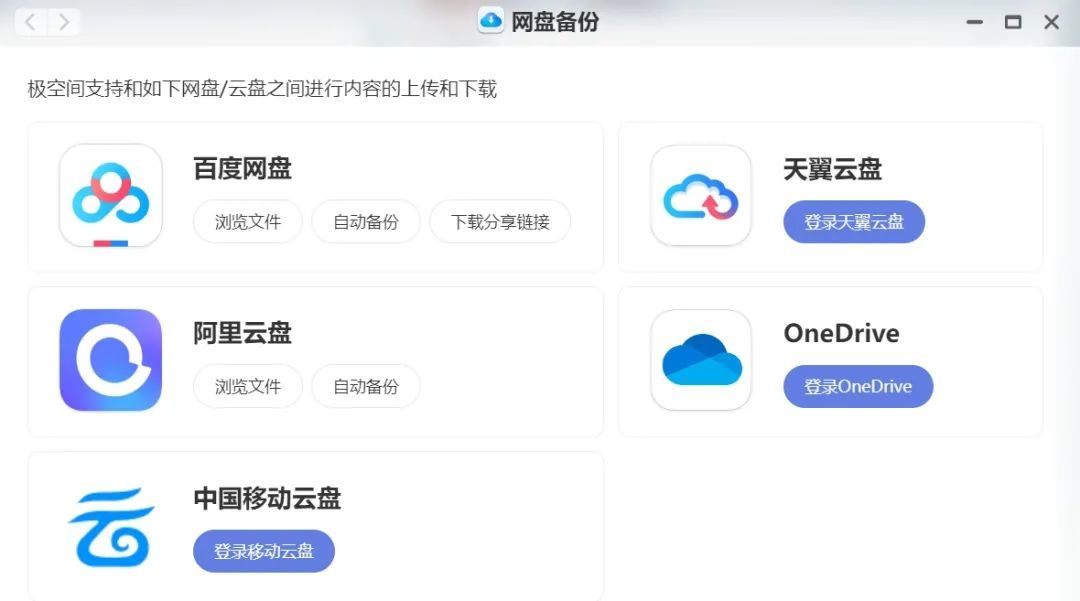 至于网盘备份,传统的做法是借助Docker容器挂载网盘然后在网盘和NAS之间进行文件互传,设置起来比较麻烦。极空间NAS的网盘备份直接集成了百度网盘、天翼云盘、阿里云盘、OneDrive、移动云盘等,直接登录就能用,即使不会部署Docker也没关系。