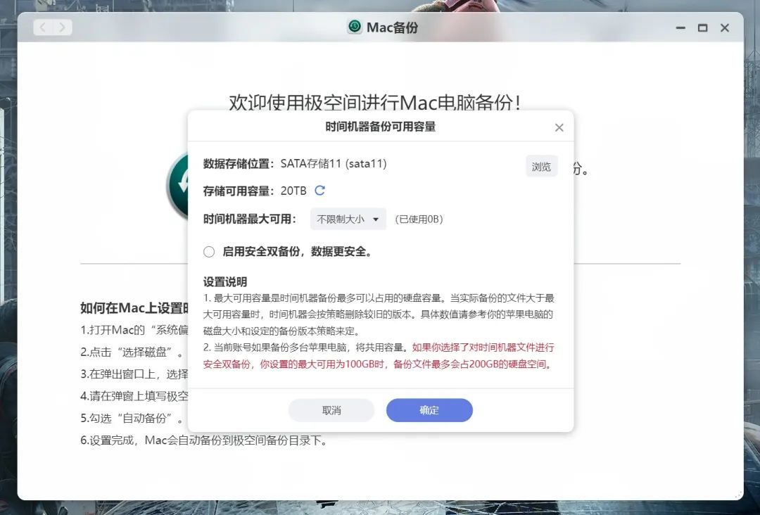 另外还支持FTP备份、Mac备份、网盘备份等,Mac备份不是那种上传文件的普通备份,而是直接支持Mac设备上的时间机器备份,更加全面、智能,对于需要使用NAS的Mac用户来说还是挺实用的。