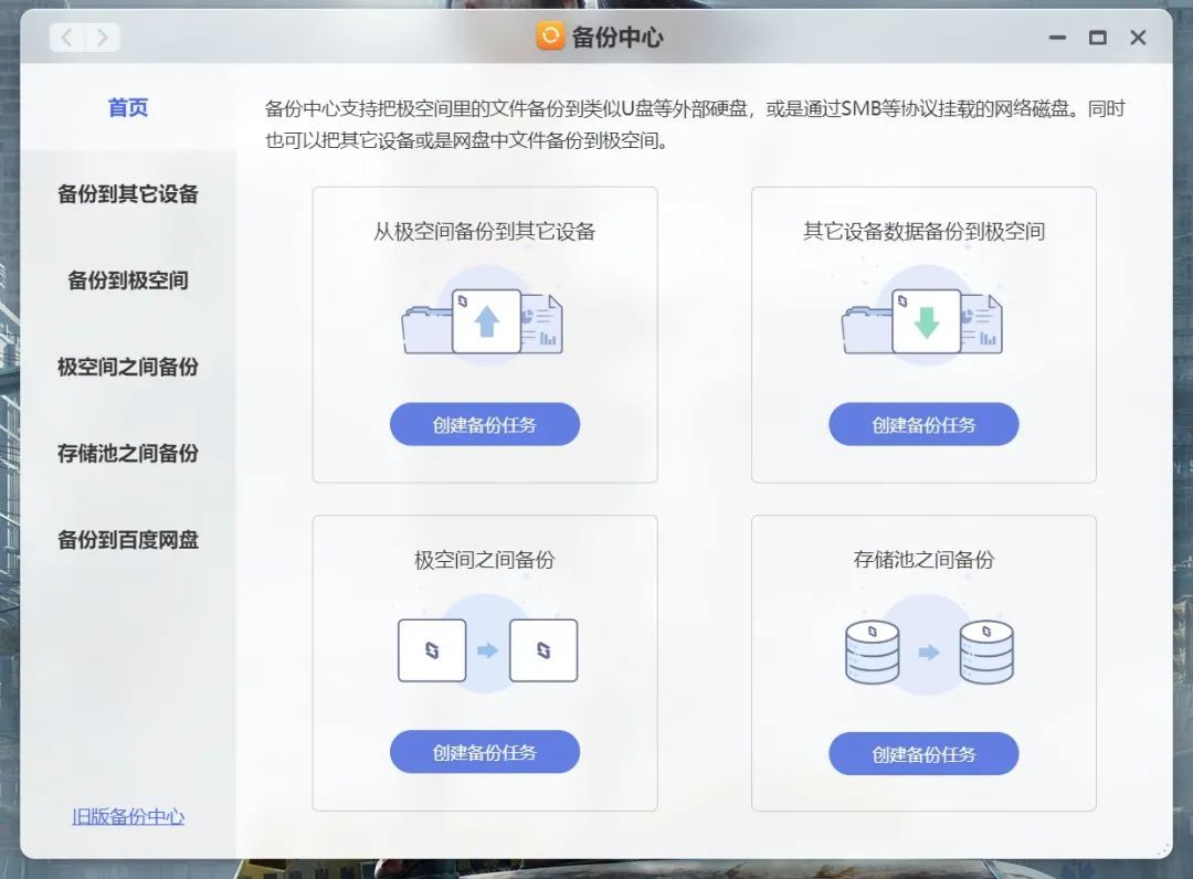 极空间支持多种开机就能用的下载、备份功能,备份中心可以选择多种备份形式主动创建备份任务,并且支持跨端备份,直接点击、选择就能用,后台自主备份也不用时刻查看。