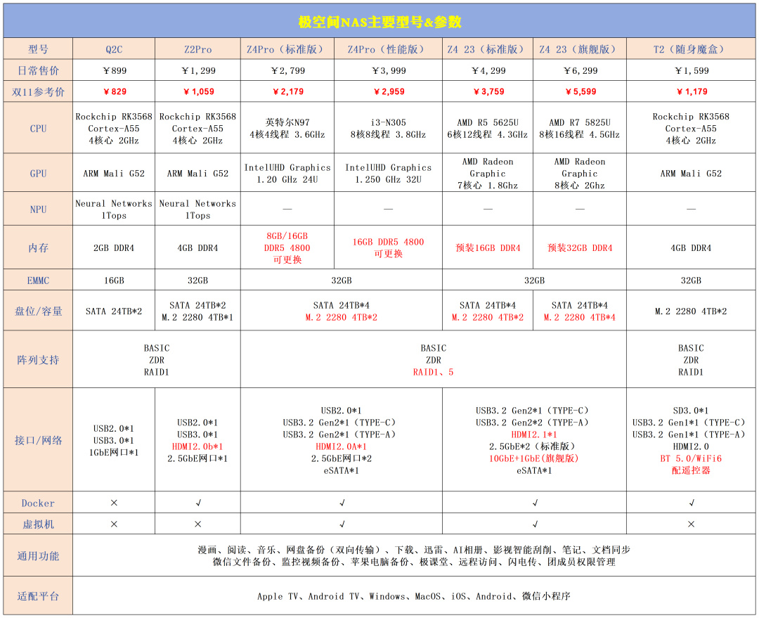 极空间目前在售的NAS型号主要有入门级的Q2C、Z2Pro,可以满足常规家用及性能需求的Z4系列以及主打轻巧便携的T2,每款型号都各有特点,其中Z4Pro和Z423版又分为性能版和标准版,为了方便大家对比,做了一张表。