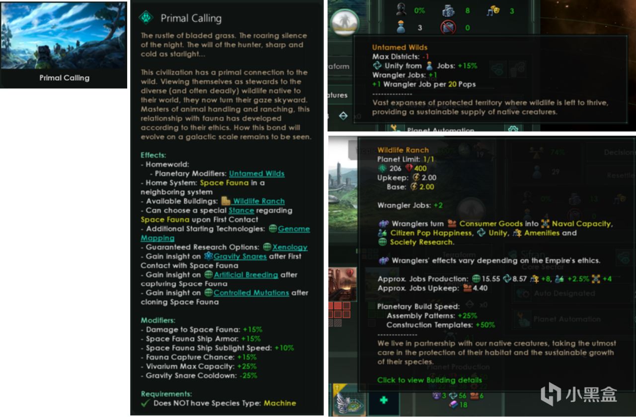 效果:母星为原始荒野,主星系邻近存在太空生物,可建造野生牧场,首次接触太空生物时可选择特殊立场。