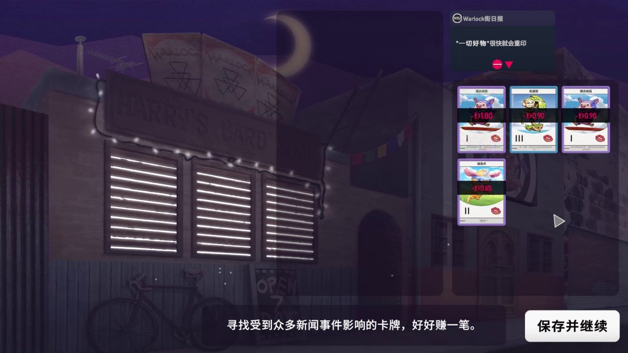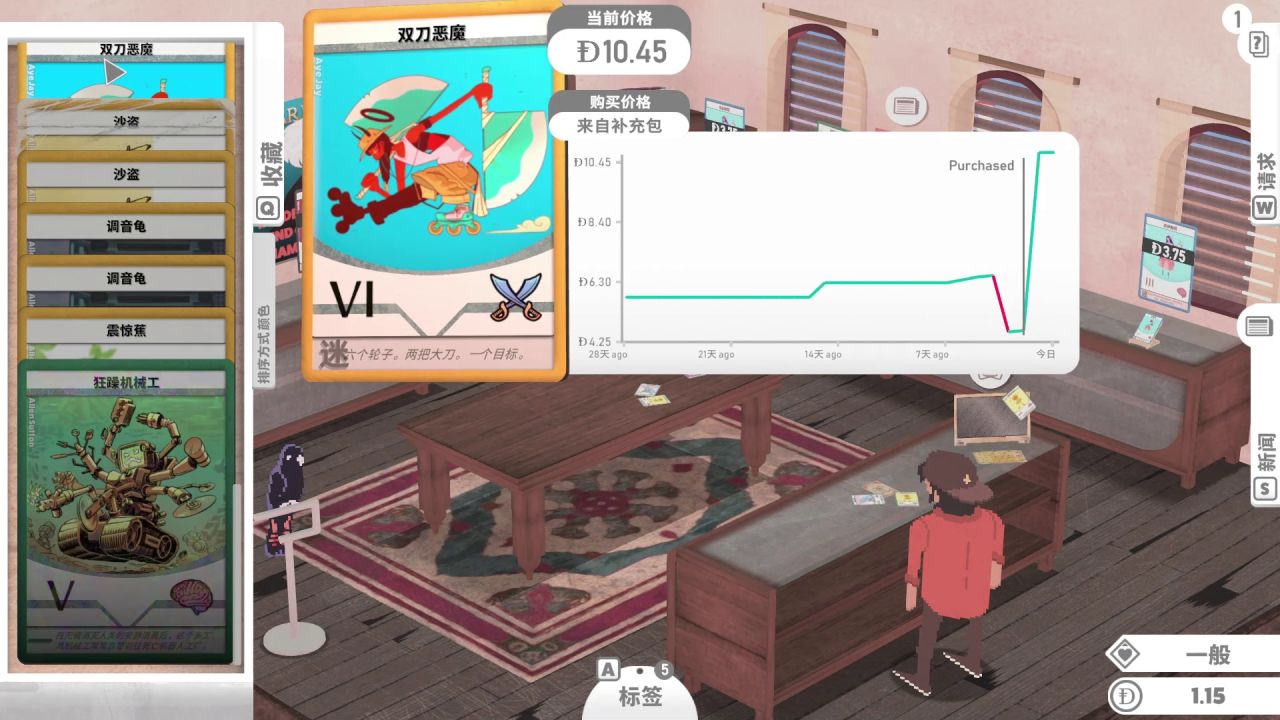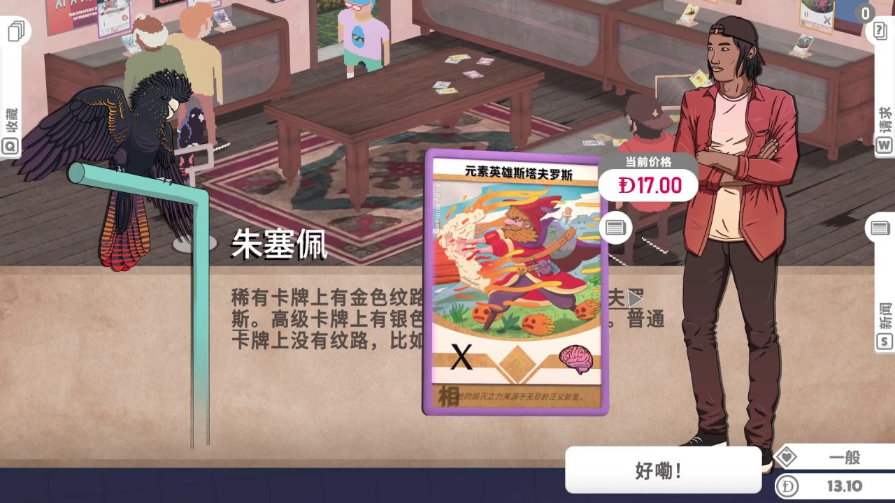是個還不錯的卡牌開店遊戲,內容可能會比較重複。開卡包和收集的過程很吸引人,另外就是看到自己低價買入的卡再某些事件發生後,一下子高價賣出的喜悅感還不錯。