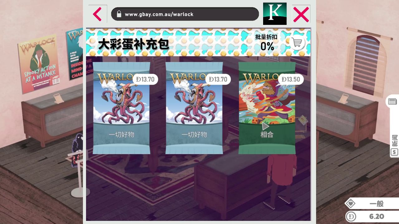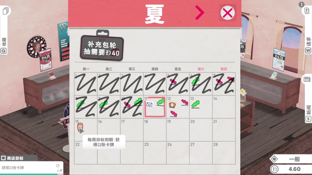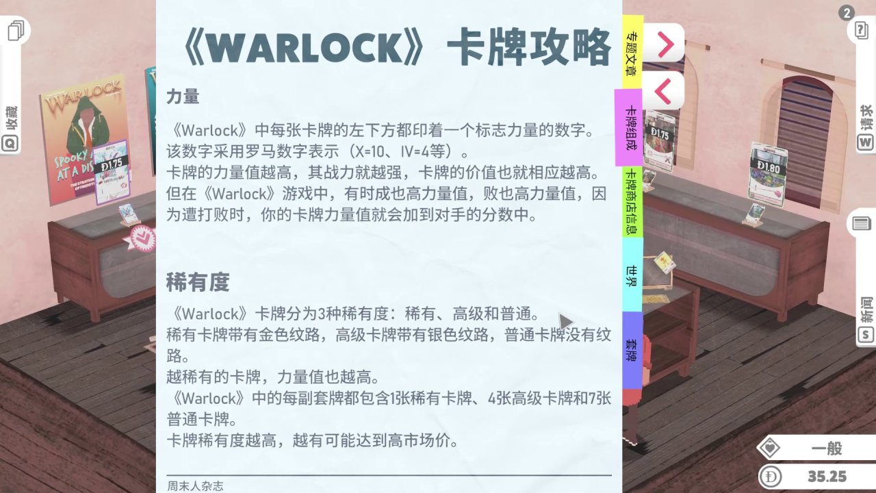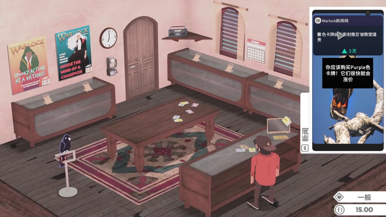 是個還不錯的卡牌開店遊戲,內容可能會比較重複。開卡包和收集的過程很吸引人,另外就是看到自己低價買入的卡再某些事件發生後,一下子高價賣出的喜悅感還不錯。