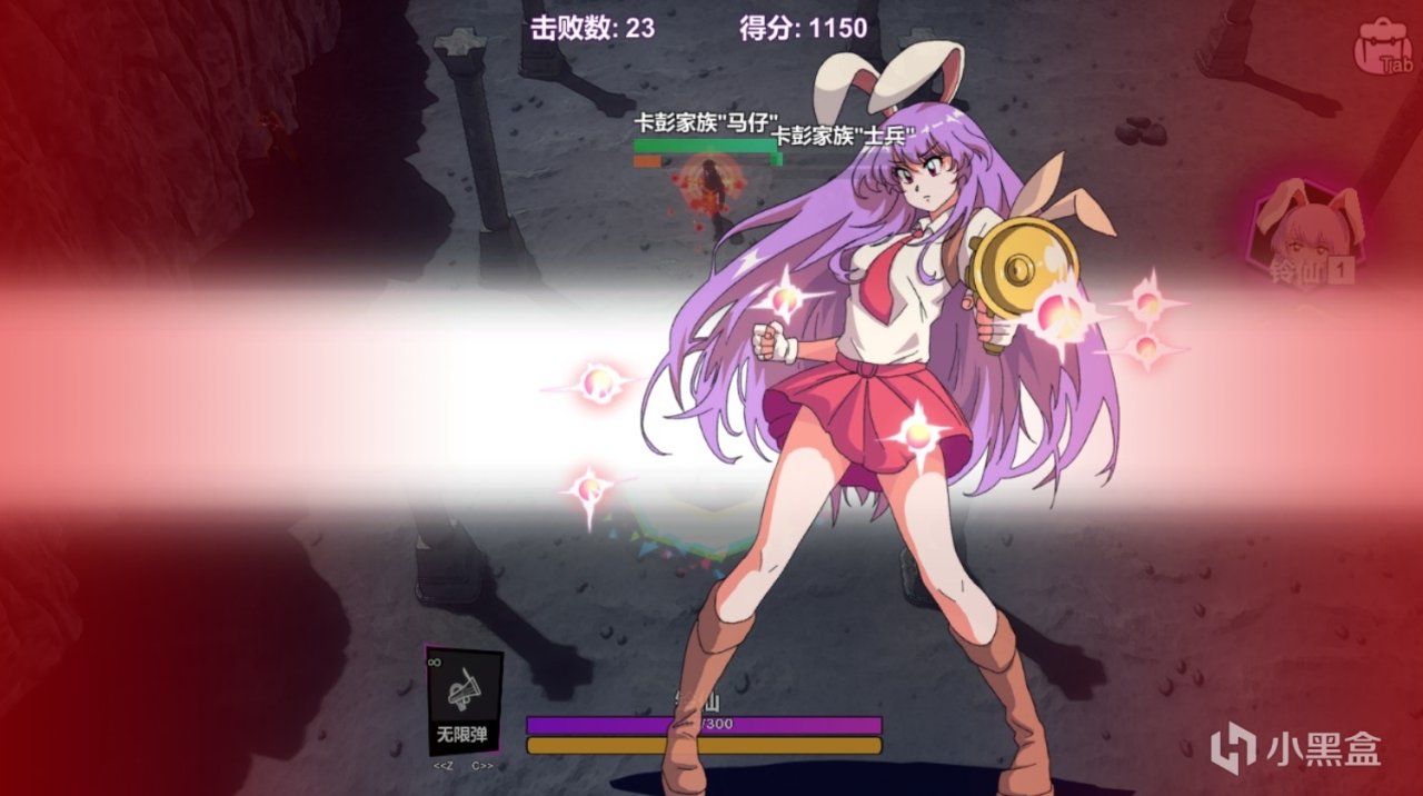 当然这边是扯远了,本篇的主角其实就是标题中的游戏——东方:月兔狂想曲,就目前放出的部分来看,其整体的剧情流程只有17分钟左右,且难度并不算高,玩法上也是类似于其他大部分二创车万游戏一样的类弹幕游戏,但与其不同的是,本次的月兔狂想曲,你可以弹反,并不是完美闪避或者擦弹,而是弹反,这点就有点偏向动作游戏的感觉了,且大部分情况下的手感都还算不错,当然翻滚闪避当我没说,多少有点果粒橙了,我还是有点不习惯的。