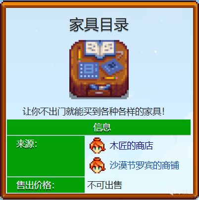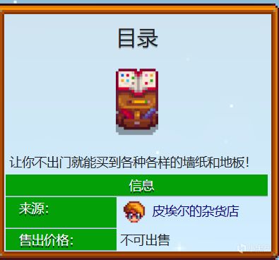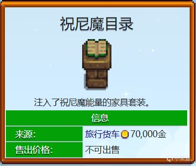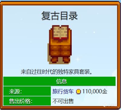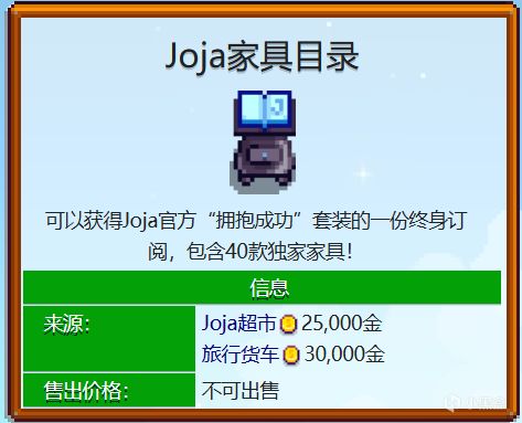 完成社區獻祭或joja 社區發展申請書後,該目錄有 10% 的幾率出現在旅行貨車中,售價爲70000金