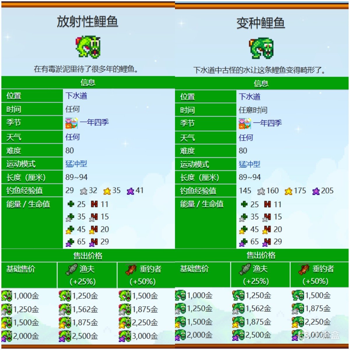 在下水道可以釣到一代魚王變種鯉魚,它是五種傳說魚類中的一種,以及對應的後代二代魚王放射性鯉魚,它是齊先生的特別任務“大家族”中的五種傳說魚類之一,它的售價、治療效果和釣魚地點均與變種鯉魚相同,但只有在任務期間才能被釣到