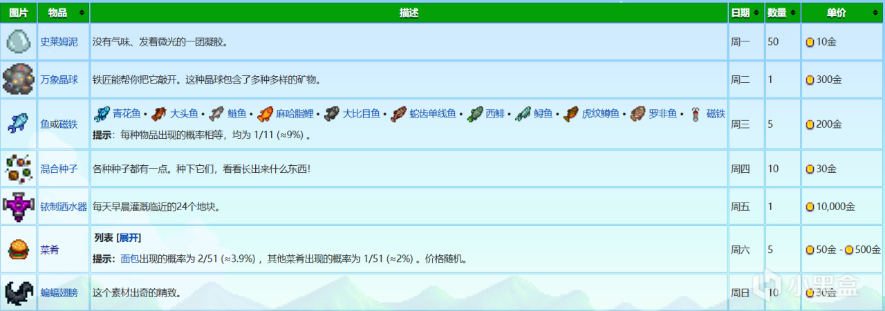 他的商店出售各種稀有物品,商店一直開放,即使是節日也不例外。有一部分商品常駐,其他商品滾動出售