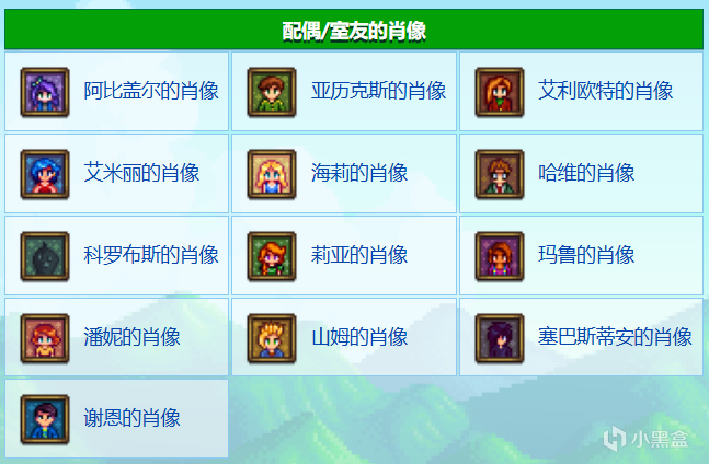 在一位村民成爲你的配偶或科羅布斯成爲你的室友以後,只要你與其達到14顆心的好感度,旅行貨車就會以30,000金的價格固定出售對應的肖像