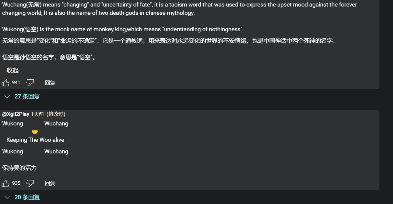 《明末:渊虚之羽》的中英文标题引发了评论区国外玩家的讨论,英文标题中出现的“WUCHANG”让很多不理解其含义的老外很快联想到了此前大火的另一款国产游戏《黑神话》(WUKONG)。