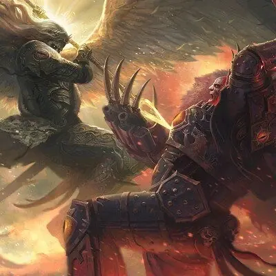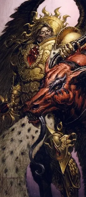 聖吉列斯猛然的伸出他的左手,絕望的猛擊他兄弟的臉頰和眼睛,荷魯斯憤怒的呼喊,丟下了他的獵物,聖吉列斯跪倒在地,每個傷口都在疼痛,然後支撐不住,翻滾着倒下了。他試圖站起來,他在顫抖,他很虛弱,他想站着面對死亡,他想站着面對——