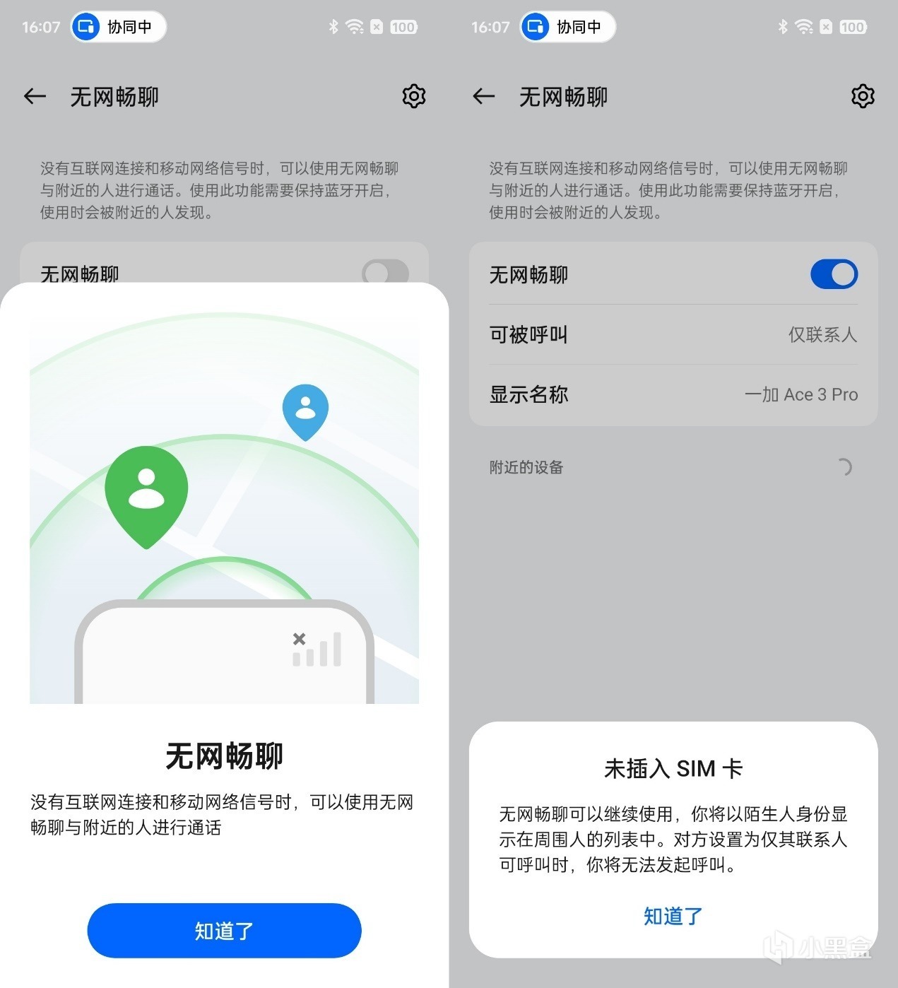 至於“無網暢聊”功能,簡單來說就是在沒有網絡信號的環境下,一加Ace 3 Pro也能通過藍牙5.4技術實現對講機功能,從而可以更方便的與附近的人進行基本的溝通交流,不用擔心在音樂會或演唱會這類人多的場景下找不到人的麻煩,當然既然是通過藍牙技術實現,那麼通話範圍就會取決於實際環境對藍牙信號的影響強度。
