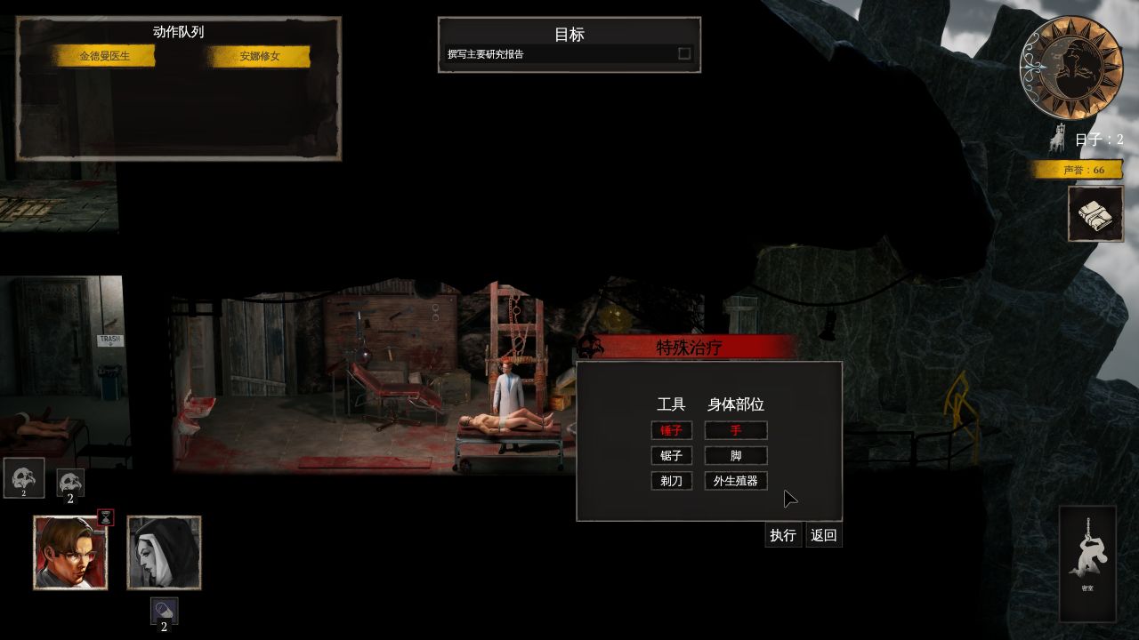 你需要同时控制金德曼医生和安娜修女两人进行配合赚取声望,同时用毒药给自己的小仓库添丁,不眠不休40天去完成自己的邪恶医学论文