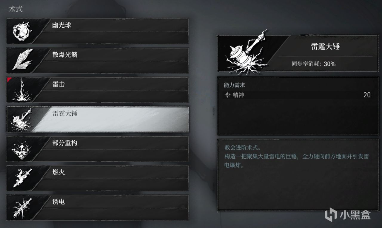 术式包括上图7种,雷击是初始、部分重构的回血在第一章也可以拿到,燃火和诱电是给武器BUFF,剩下的三个技能,雷霆大锤是突击、散爆光鳞是后撤,幽光球是原地,总的来说——如果这就是最终的法术表,感觉内容相对还比较少。