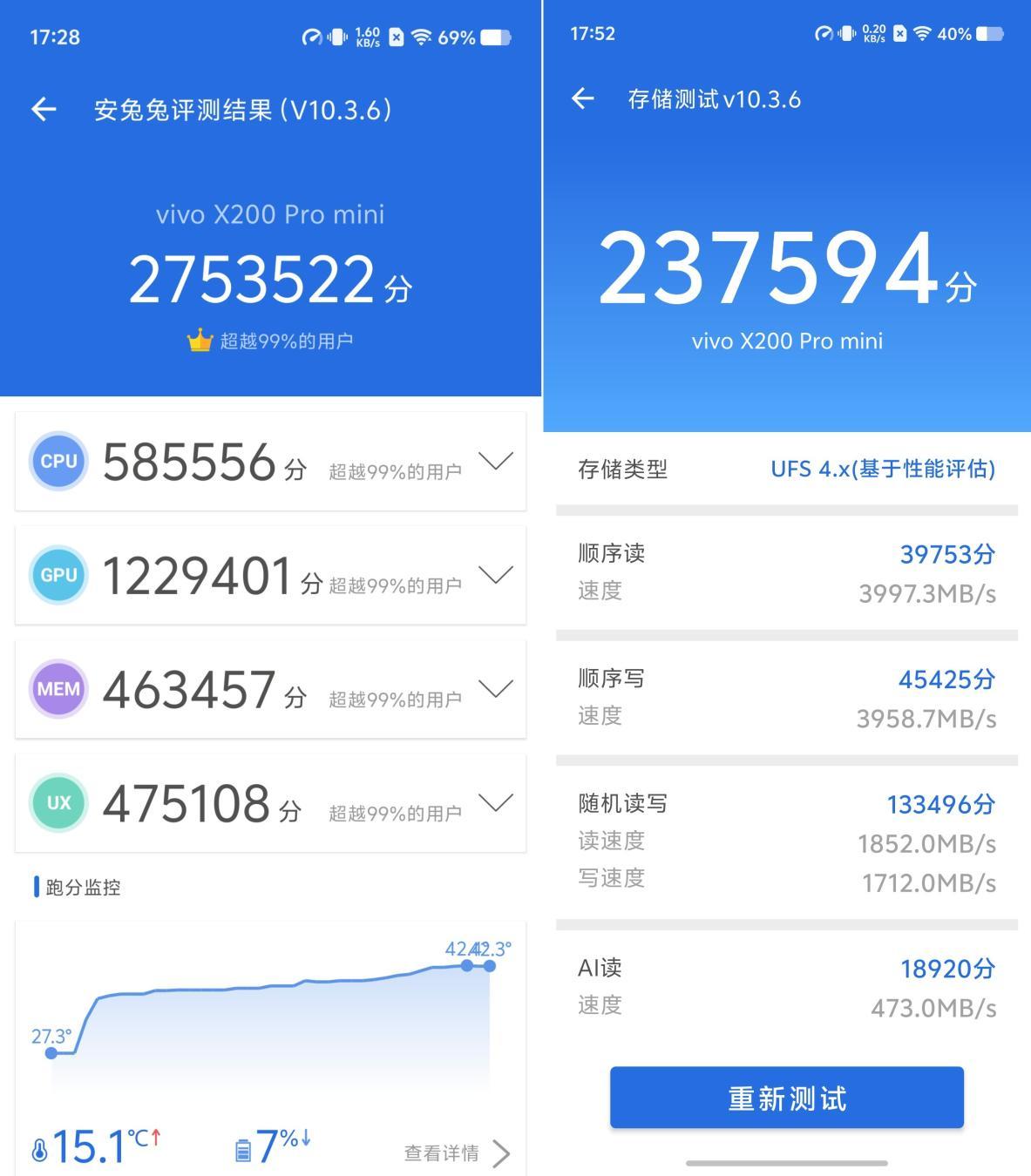 存儲測試中,vivo X200 Pro mini得分237594分,其中順序讀取3997.3MB/s,得分39753分;順序寫入3958.7MB/s,得分45425分;隨機讀取1852.0MB/s,隨機寫入1712.0MB/s,得分133496分;AI讀取473.0MB/s,得分18920分。