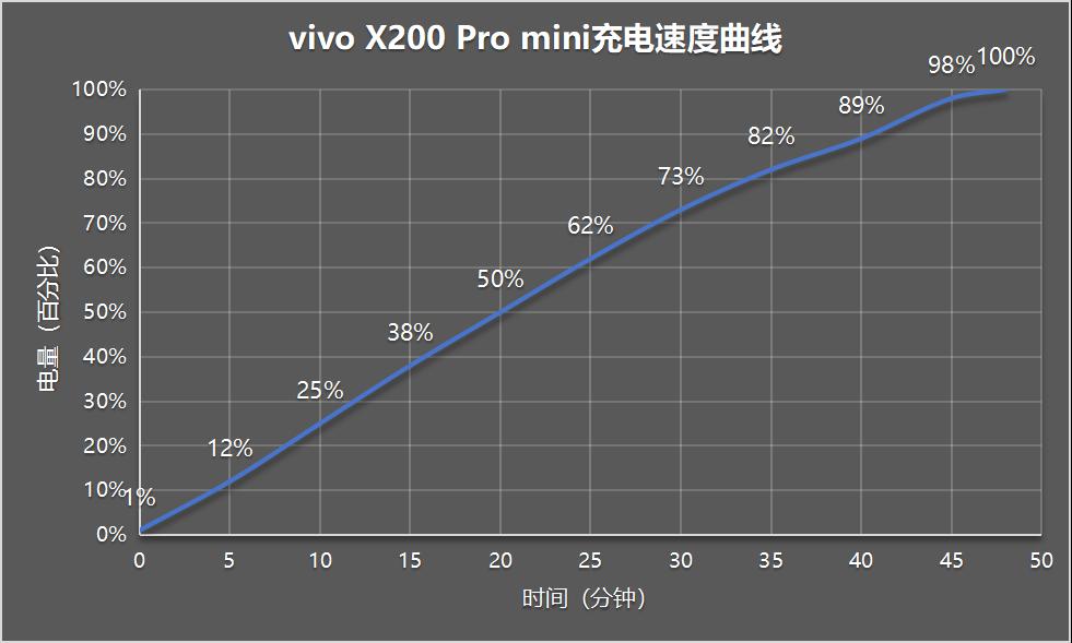可以看到,vivo X200 Pro mini開始充電10分鐘後,電量來到25%,20分鐘充電50%,30分鐘73%,最終於48分鐘時完全充滿。