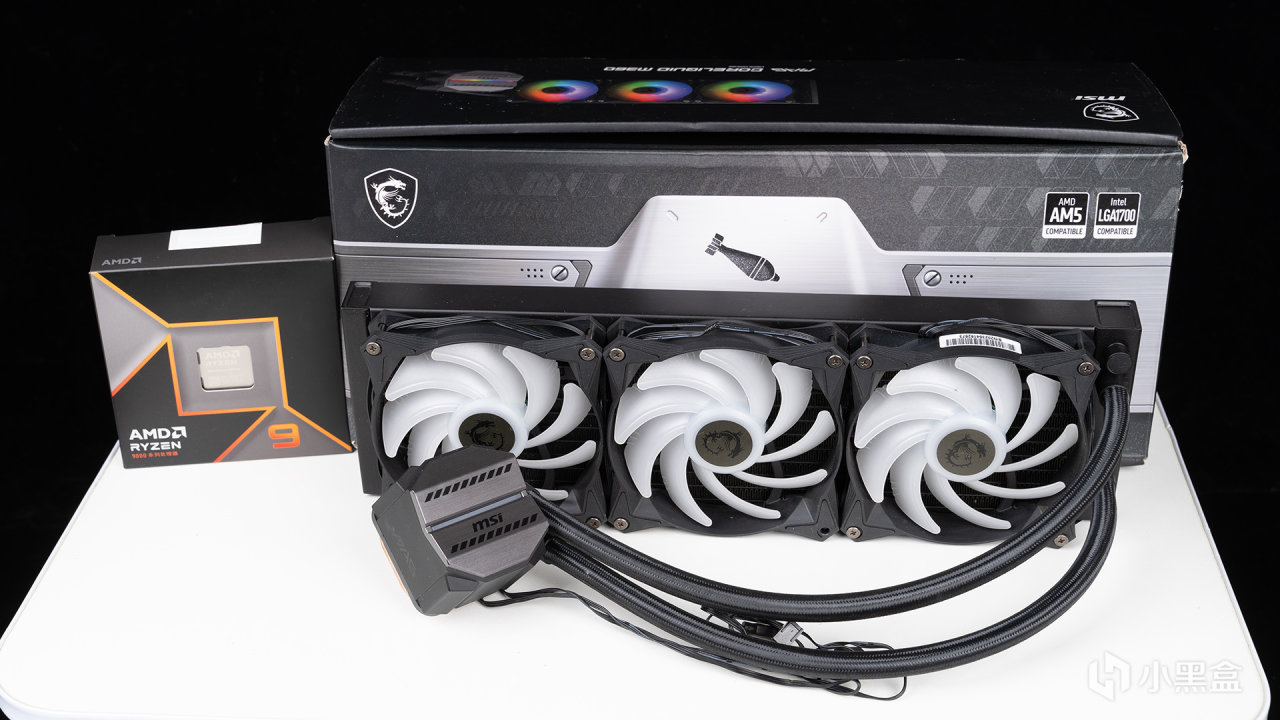 測試CPU是銳龍5 9600X,使用散熱器是微星MAG CORELIQUID M360迫擊炮,正如其命名一樣,冷頭部分採用了經典的軍火庫風格,中間區域還有橫槓式的ARGB燈效,配備三枚雙滾珠軸承風扇,並有微凸銅底設計,官方實測能穩壓i9-13900K,這顆能耗比高很多的9600X壓制起來自然就很輕鬆。