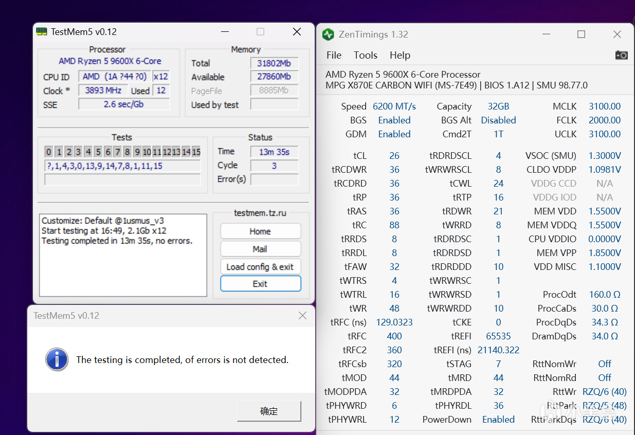 上機第一件事情當然是對這套女武神二代DDR5 6000C28進行摸底,鑑於CPU體質約束,UCLK=MEMCLK同頻狀態下最高能達到的頻率爲6200MHz,而時序優化爲C26-36-36-36,並且對tREFI、tRFC等多個小參可進一步縮緊,這種狀態下也能完美0錯誤通過TestMem5 & 1usmus_v3配置烤機,如果CPU體質更好些,相信衝擊6400C26也是問題不大,另外也可通過拉高FCLK頻率來提升性能,這裏是默認2000MHz。
