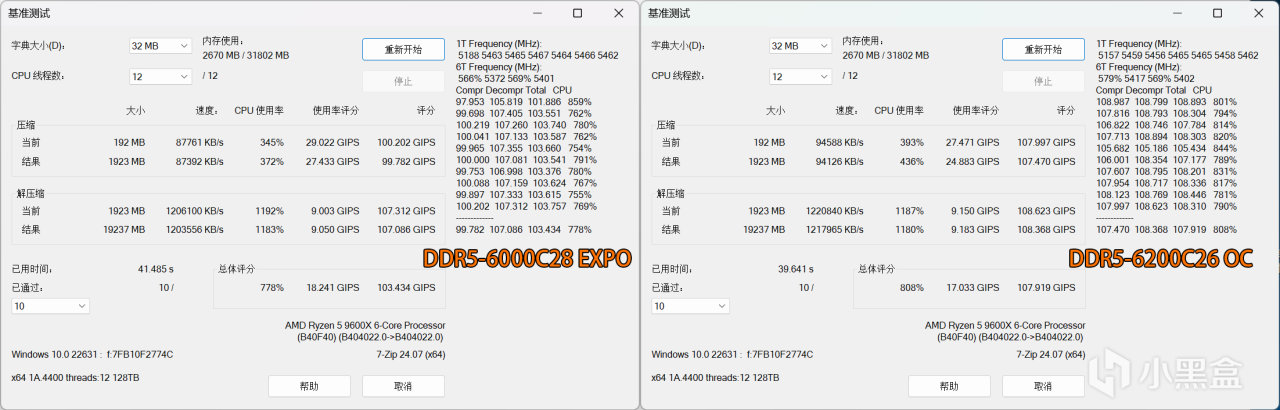 7-ZIP壓縮、解壓縮項目,最明顯的提升是壓縮項目,一定程度上關聯CPU和內存性能,手動超頻相比EXPO壓縮性能可提升7.7%之多,日常在打包文件中就能體現處差距,解壓縮提升就不明顯了,這是因爲主要關聯CPU多線程規格。