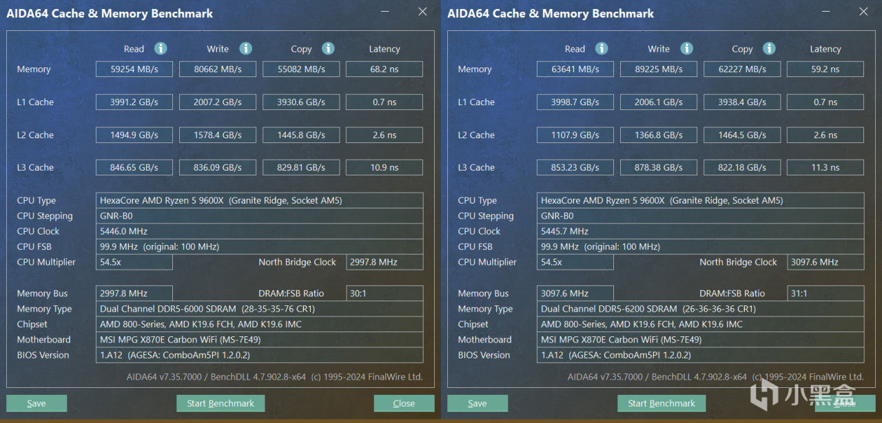 AIDA64內存和緩存測試,EXPO達成的6000C28效果相當不錯,尤其是內存延遲比常規C32條子要低一點,而手動超頻之後,讀取、複製兩項達到63000 MB/s左右,寫入更是很接近90000 MB/s,至於內存延遲是最爲直觀的,大幅度降至59.2 ns,可見銳龍9000的性能潛力還是有的!