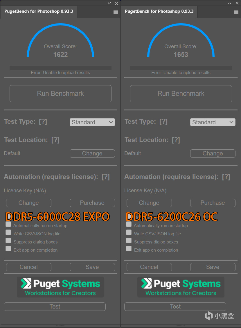 PugetBench for Photoshop基準跑分,EXPO超頻得分爲1622,而手動超頻爲1653,提升幅度大概爲2%左右,聊無勝無吧。