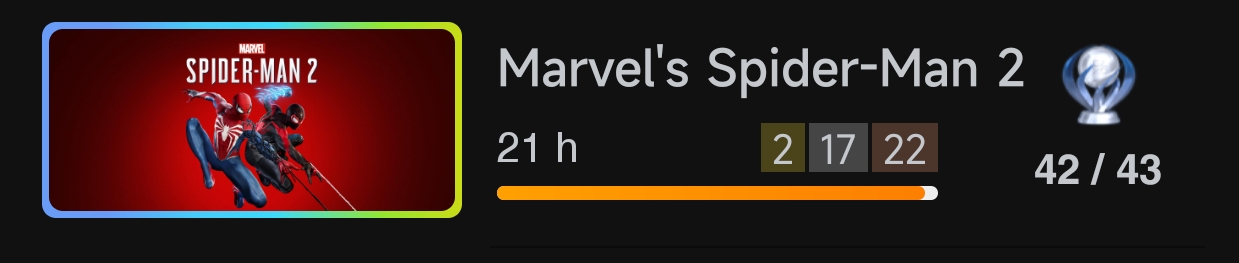 游戏的白金流程相比蜘蛛侠1还是简单许多的。本作打击感爽快,特效拉满,属于是索尼技术力拉满的一作,使用了较多的新技术如无缝切换角色,无读条传送都是游戏的亮点。但是游戏深陷政治正确漩涡,夹带了不少政治正确私货。同时流程较短,按国区售价应该在400元左右,想要在steam购买蜘蛛侠2的玩家建议慎重考虑。光盘玩家现在百亿补贴折扣250元左右比较合适。